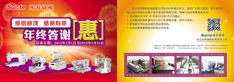 浙江所特縫制機械有限公司自2000年成立至今,深受廣大客戶厚愛,現(xiàn)年終將至,我公司為感謝各位客戶多年來對所特的支持,現(xiàn)公司將拿出電腦平車600臺,電腦平頭鎖眼機50臺進行感恩答謝活動。