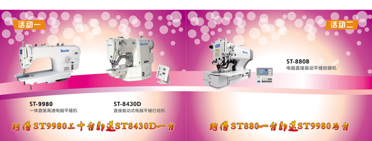 1,活動期間夠得電腦平車ST-9980三十臺即送電子套結(jié)機ST-8430D一臺;購得電子平頭鎖眼機ST-8800B一臺即送ST-9980兩臺