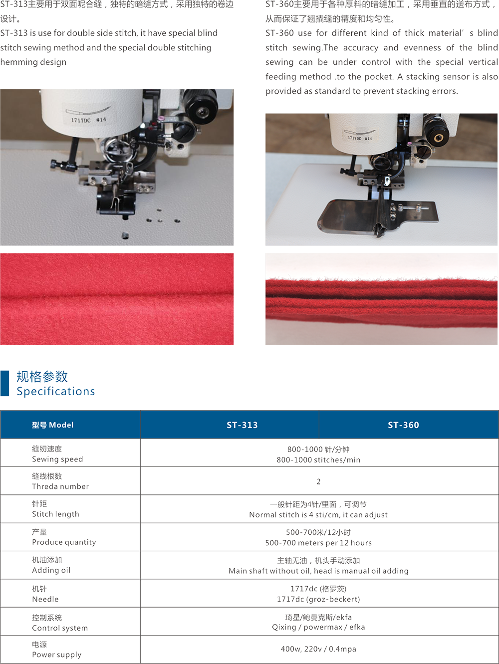 ST-313 is use for double side stitch, it have special blind stitch sewing method and the special double stitching hemming design