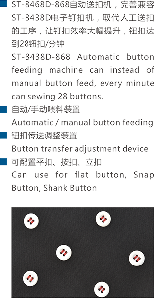 ST-8468D-868自動送扣機,完善兼容ST-8438D電子釘扣機,取代人工送扣的工序,讓釘扣效率大幅提升,鈕扣達到28鈕扣/分鐘
